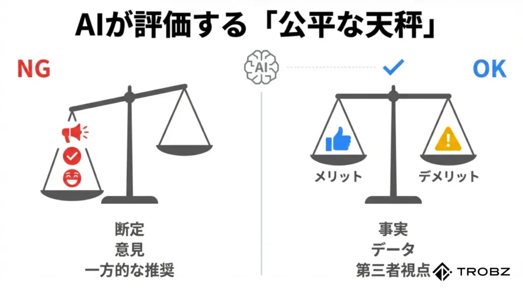 アフィリエイト記事などでよく見られるのが、メリットばかりを並べ立て、デメリットを隠そうとする構成です。これはGEOにおいては悪手です。AIはネット上のあらゆるレビュー情報を学習しており、その商品の欠点もすでに知っているからです。