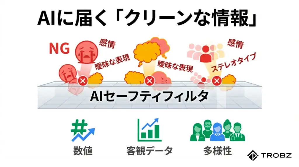 AIは「中立」で「安全」な情報を何よりも好みます。逆に言えば、少しでも偏り(バイアス)を感じさせるコンテンツは、リスク要因として学習データから弾かれる傾向にあります。これは、あなたの記事がつまらないからではありません。AIの「公平性」という新たな評価基準に適応できていないだけなのです。