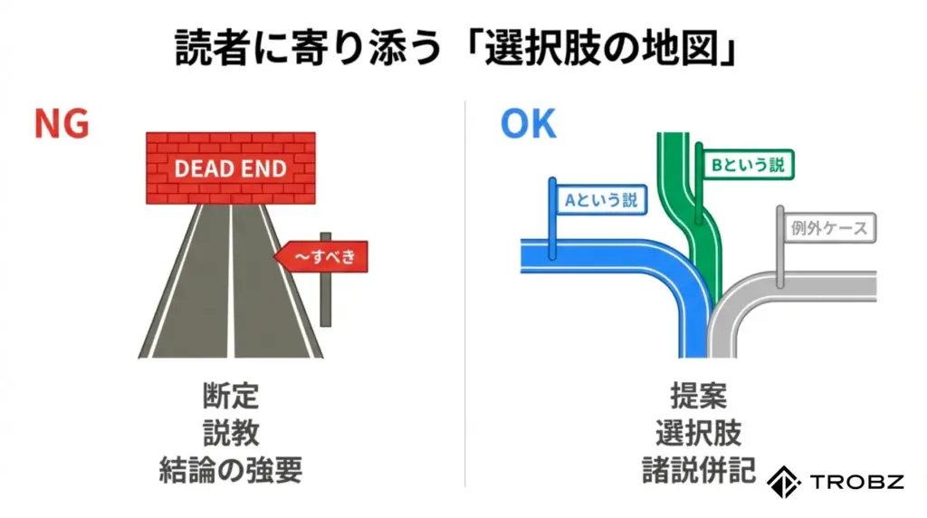 この「逃げ道」を作っておくことが、記事全体のバランスを整え、AIに「公平で配慮の行き届いたコンテンツ」だと認識させるための鍵となります。
