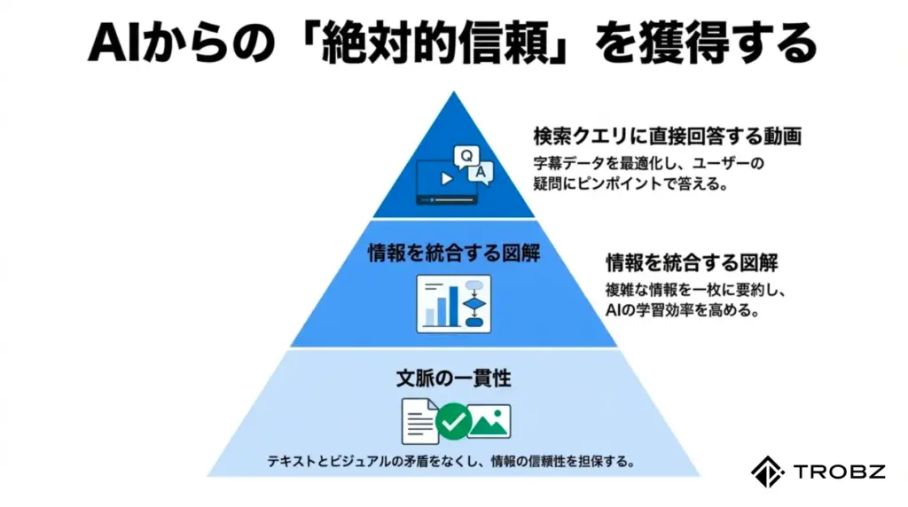これを専門的には「マルチモーダル対応」と呼びます。AIにとって、テキストは情報の「骨組み」であり、画像や動画は情報の「具体性」や「証拠」です。これらが揃って初めて、「信頼性が高く、ユーザーの役に立つ情報源」として認定されるのです。