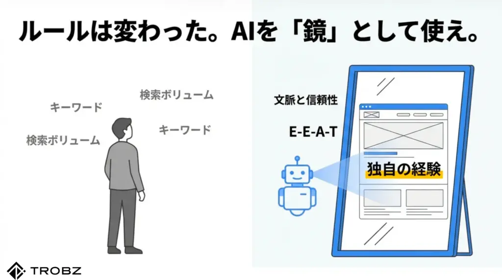 最も重要なポイントは、SEOが「キーワードのマッチング」から「文脈と信頼性の評価」へとシフトしたという事実です。小手先のテクニックでAIを騙すことはもはや不可能です。しかし、独自の体験(Experience)と一次情報を論理的に伝えることができれば、個人サイトであっても大企業やAI自身に勝る「信頼」を勝ち取ることができます。