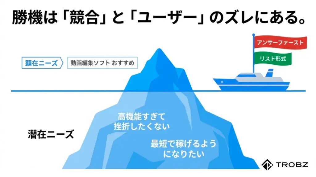 • ペルソナA(副業初心者):顕在ニーズは「安いソフトが知りたい」だが、潜在ニーズは「高機能すぎて挫折したくない、最短で稼げるようになりたい」。