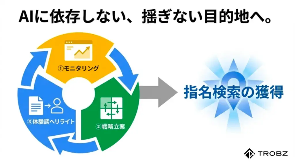 AIは「一般的な質問」には割り込みますが、「〇〇社の料金プラン」や「〇〇ブログの解説」といった、特定の固有名詞を含む検索に対しては、公式サイトを素直に案内する傾向があります。つまり、AIO戦略の究極のゴールは、記事を読んでくれたユーザーに「次はAIではなく、このサイトを直接見に来よう」と思わせるファン化にあるのです。