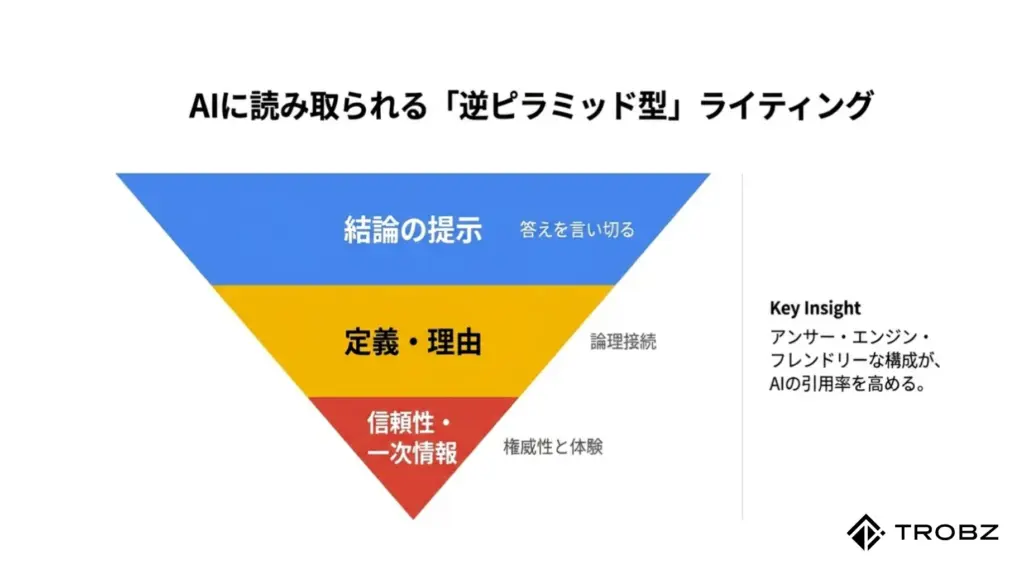 私自身、多くの記事をリライトしてきましたが、冒頭の300文字で結論を言い切る形式に変えるだけで、AIによる引用率が劇的に改善した例をいくつも見てきました。AIは「探す」コストを極端に嫌う、という性質を忘れてはいけません。