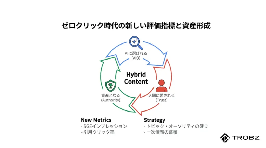 これからの検索結果画面は、AI回答と従来のリスト形式が共存するハイブリッドなものになります。ユーザーは、簡単な事実確認はAI回答で済ませ、より深い洞察や信頼性の高い情報を求める際には、AIが示した「引用元リンク」をクリックしてサイトを訪れます。