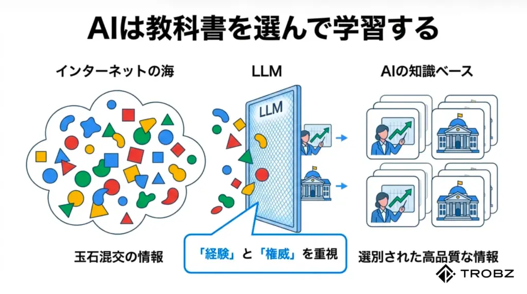 多くの人が誤解している点ですが、AI(LLM)はインターネット上の全てのテキストを平等に学習しているわけではありません。人間が教科書と個人の日記で信憑性を区別するように、AIも学習データに対して明確な「信頼度の重み付け(Weighting)」を行っています。