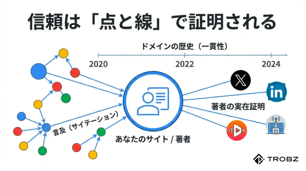 AIはウェブ全体をスキャンして、点と点を繋げています。あなたのサイト内のプロフィールと、外部サイトでの活動が線で繋がった時、初めて強力な「信頼性スコア」が付与されるのです。