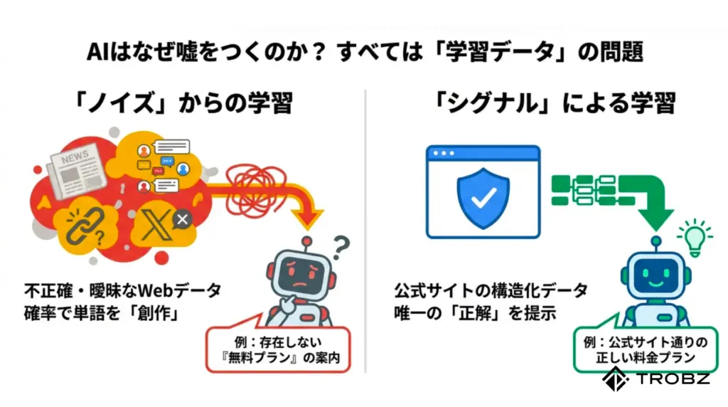 知名度が低い企業や情報は、AIの学習データが少ないため、AIが推測(幻覚)で穴埋めしようとする傾向があります。情報量が少ないからこそ、公式サイトで正確な定義を発信しておく必要があります。