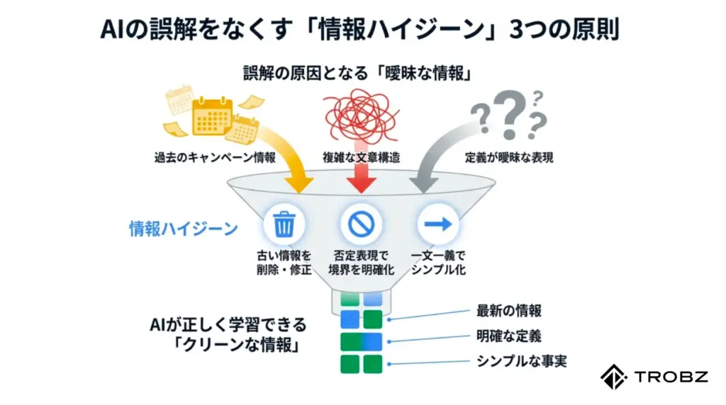 これを防ぐためには、定期的にサイト内の情報を掃除する「データハイジーン(情報の衛生管理)」が必要です。サイト内に矛盾する情報(新旧の価格、新旧の住所など)が存在しない状態を作ることが重要です。