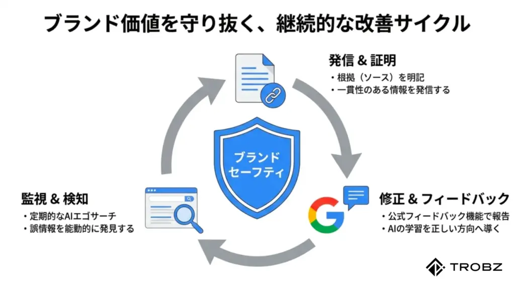 フィードバックは一度送って終わりではありません。AIの学習が反映されるまでには時間がかかるため、誤情報が消えるまで定期的にチェックし、報告を続ける粘り強さが必要です。これはブランドを守るための「デジタル自警団」としての活動といえます。